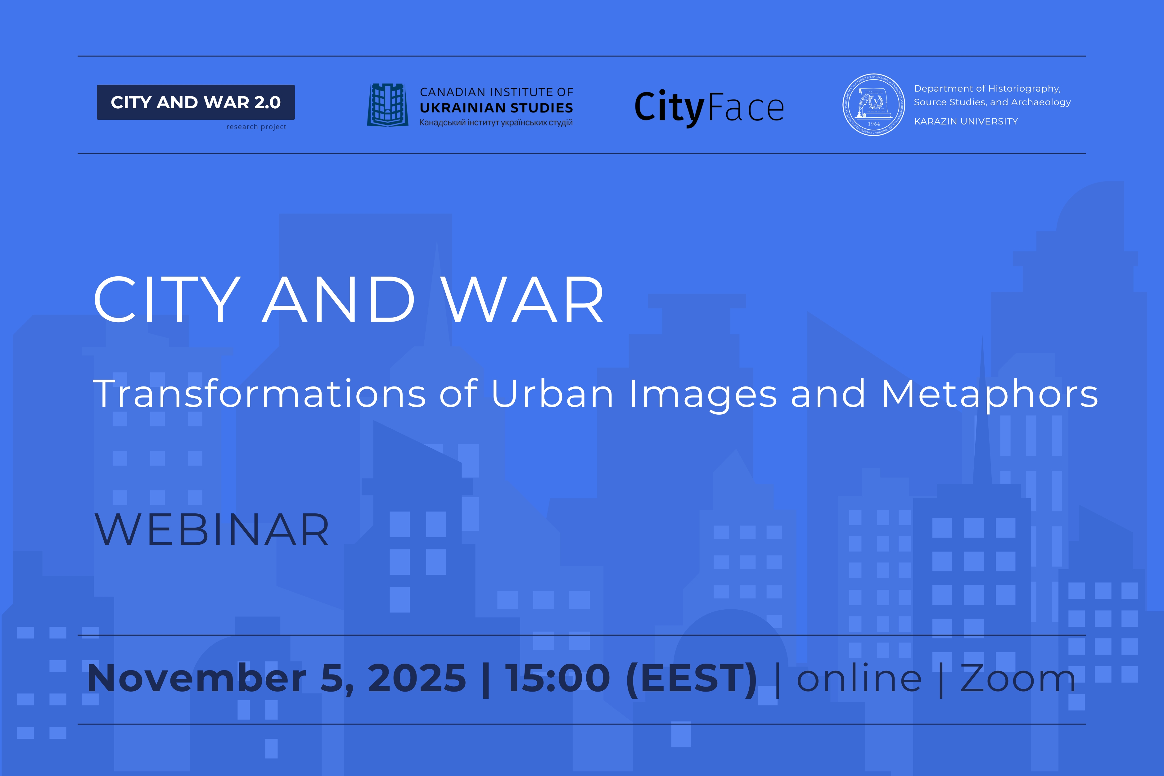 On November 5, 2025, as part of the “CITY AND WAR 2.0” project, the webinar “CITY AND WAR: Transformations of Urban Images and Metaphors” was held, focusing on major cities in eastern and southern Ukraine during the Russo-Ukrainian War. The event was co-organized by the CityFace Research Initiative; the Canadian Institute of Ukrainian Studies (CIUS), University of Alberta; and the Department of Historiography, Source Studies, and Archaeology, Faculty of History, Karazin University.